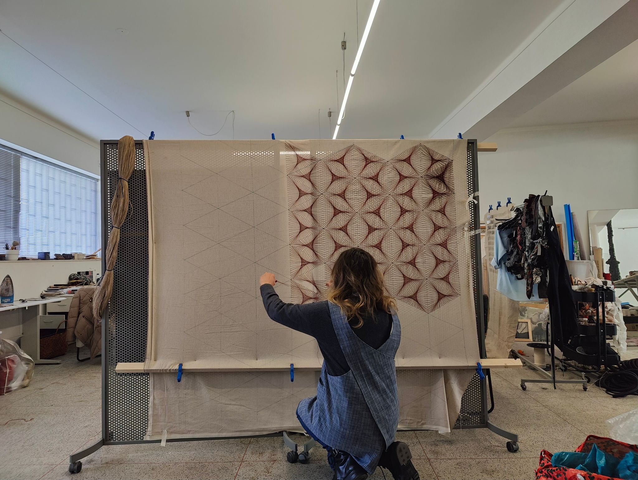 Com formação em Engenharia Civil e um Mestrado em Artes Plásticas, o percurso da artista liga o pensamento estrutural — grelhas, cálculo, sistemas — à materialidade dos têxteis e do papel.